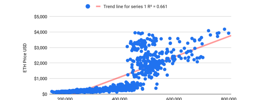 A similar trend is seen between the price of Ether and active addresses (See Gallery below). Until around 2019, there was a very strong correlation between the two. However, more recent data shows almost no correlation.